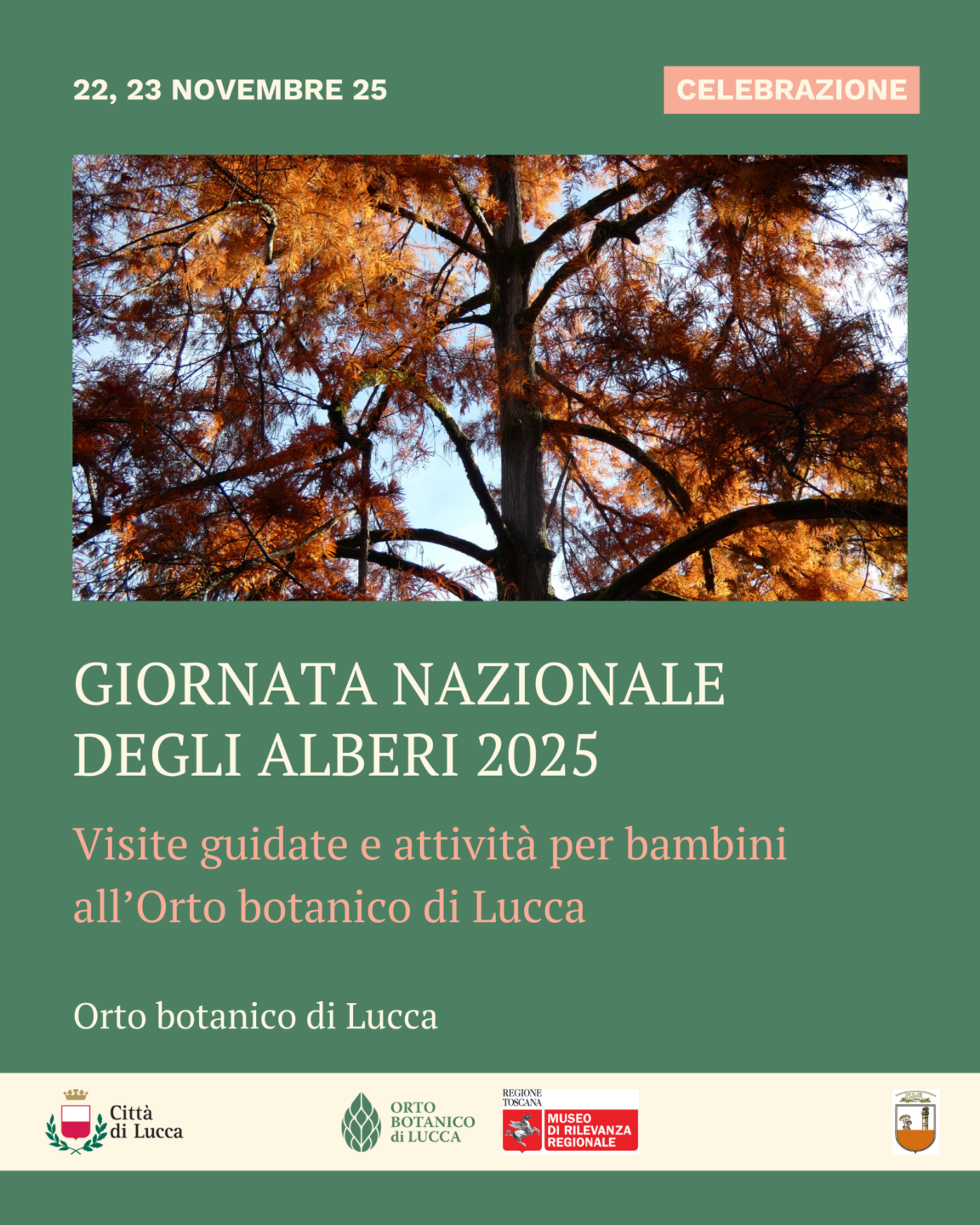 Per celebrare la Giornata Nazionale dell’Albero, che ricade venerdì 21 novembre 2025, sabato 22 e domenica 23 novembre sono previste visite guidate e attività per bambini.